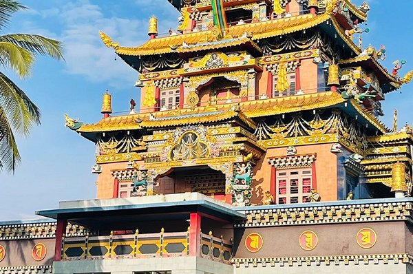 Golden Temple Monastery in Bylakuppe radiates Tibetan serenity, golden spires, prayer wheels, and monk chants.