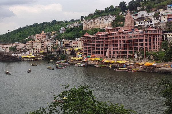 Omkareshwar Temple in Madhya Pradesh enshrines Jyotirlinga, Om-shaped island, and divine Narmada vibes.